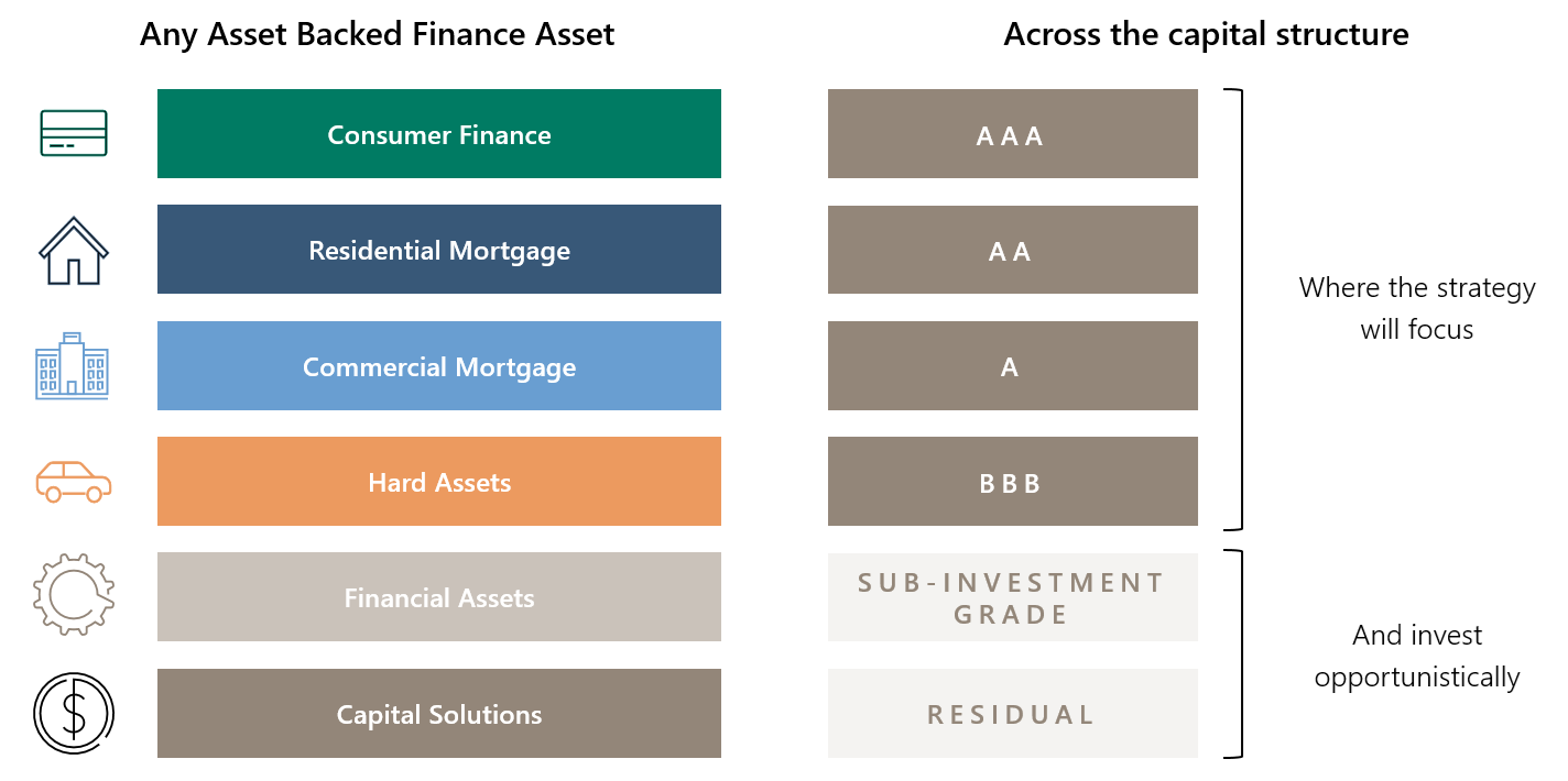 Asset Backed Finance typically involves senior secured lending, where each loan is backed by tangible or contractual assets. Collateral types can include: